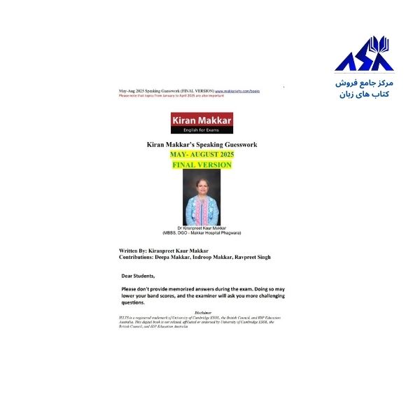 مجموعه Makkar IELTS Speaking May – August 2025 یکی از منابع معتبر و پرطرفدار برای آمادگی در بخش اسپیکینگ آزمون آیلتس است که توسط Kiran Makkar تهیه می‌شود. این مجموعه هر فصل به‌روزرسانی شده و شامل پیش‌بینی سوالات اسپیکینگ آیلتس است.